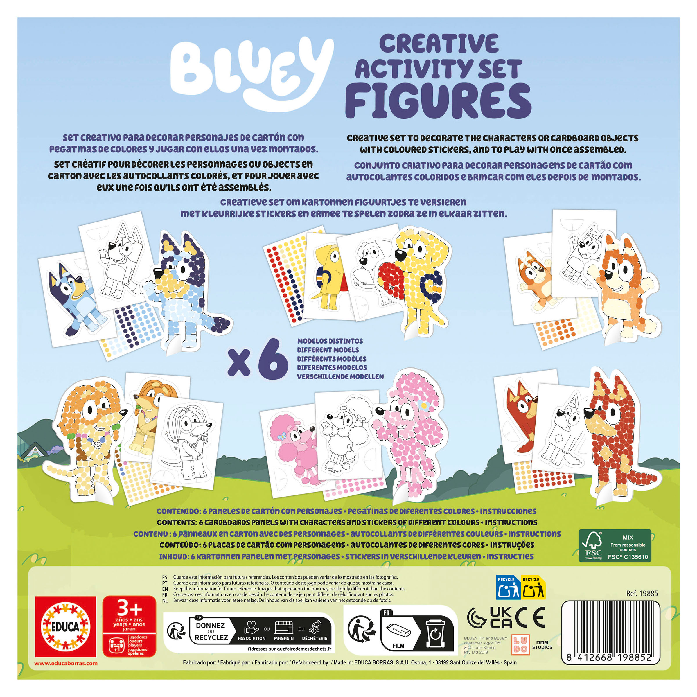 Creative set for decorating cardboard characters or objects with colorful stickers, and playing with them once they’ve been assembled and transformed into 3D characters. Game benefits: Development of fine motor skills: dexterity, attention and concentration for sticking and peeling off stickers. And to assemble the 3D characters/objects. Learning through play, encouraging : Problem-solving and imaginative play. Contents: 6 cardboard panels for assembling the 6 licensed characters and over 100 stickers in different colors.
