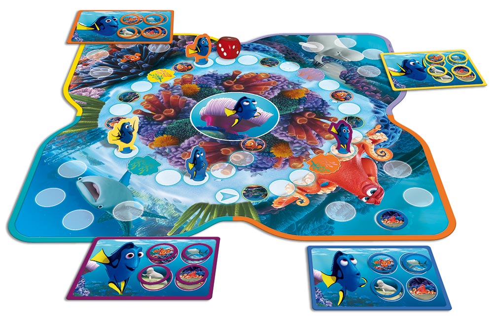 Ce jeu de société aide les plus petits à exercer leur mémoire tout en s’amusant avec Dory et ses amis. Chaque joueur choisit un jeton Dory et prend la carte « amis » de la couleur correspondante. 16 jetons « amis » sont séparés par personnage (Nemo, Destiny, Hank et Bailey) et ils sont placés à l’envers sur les quatre coins du plateau de jeu, dans la zone correspondant au personnage. Le gagnant est le premier joueur qui arrive à compléter sa carte « amis » avec les quatre jetons des personnages de la couleur correspondante et à retrouver Dory au centre du plateau.