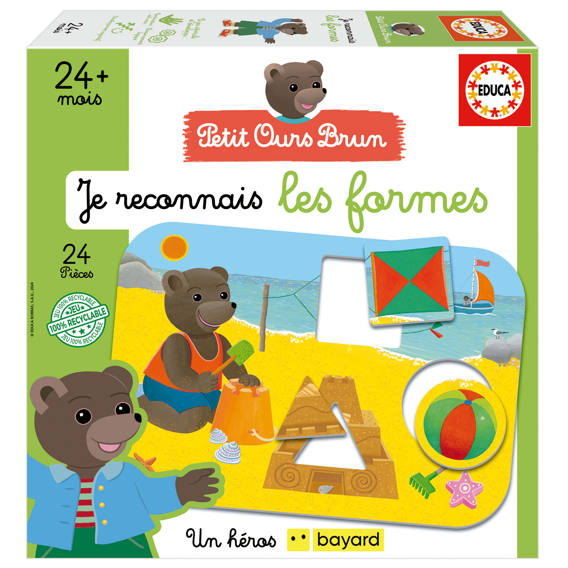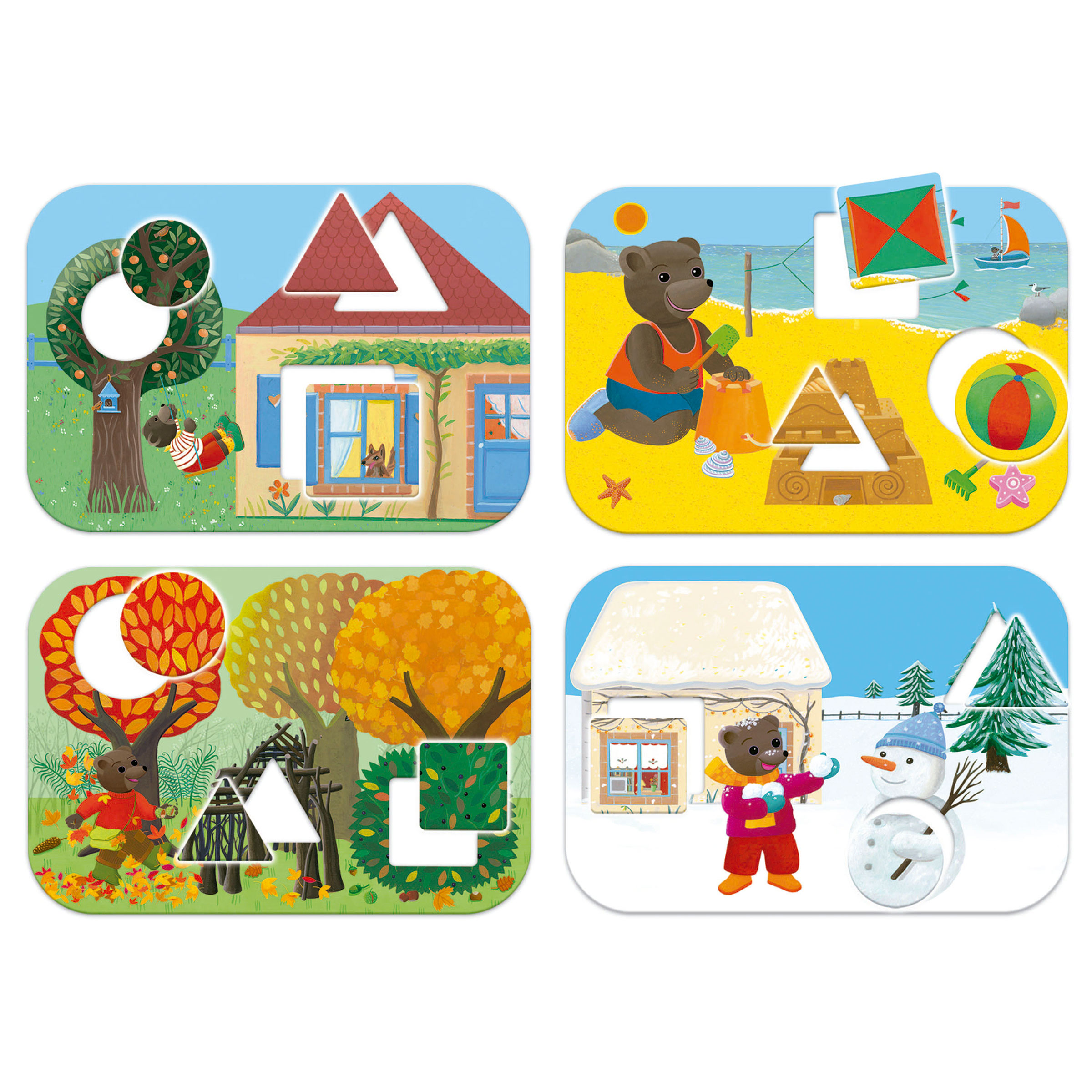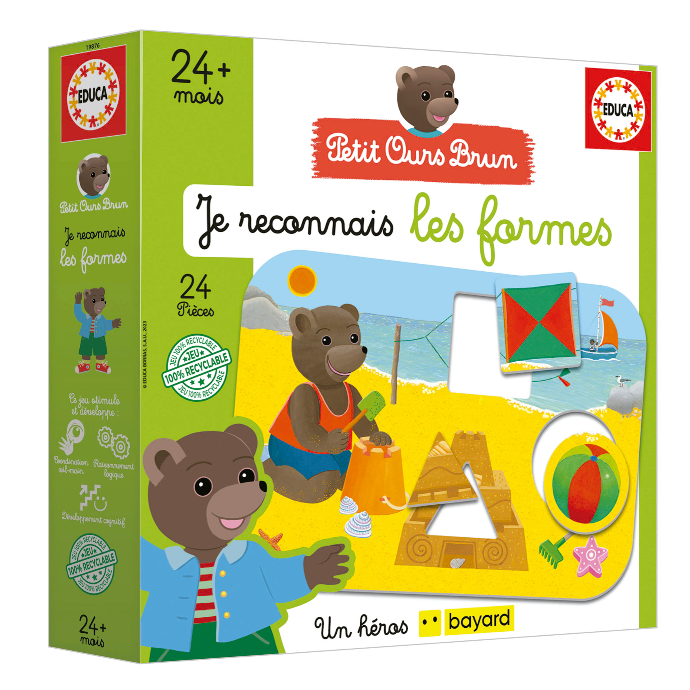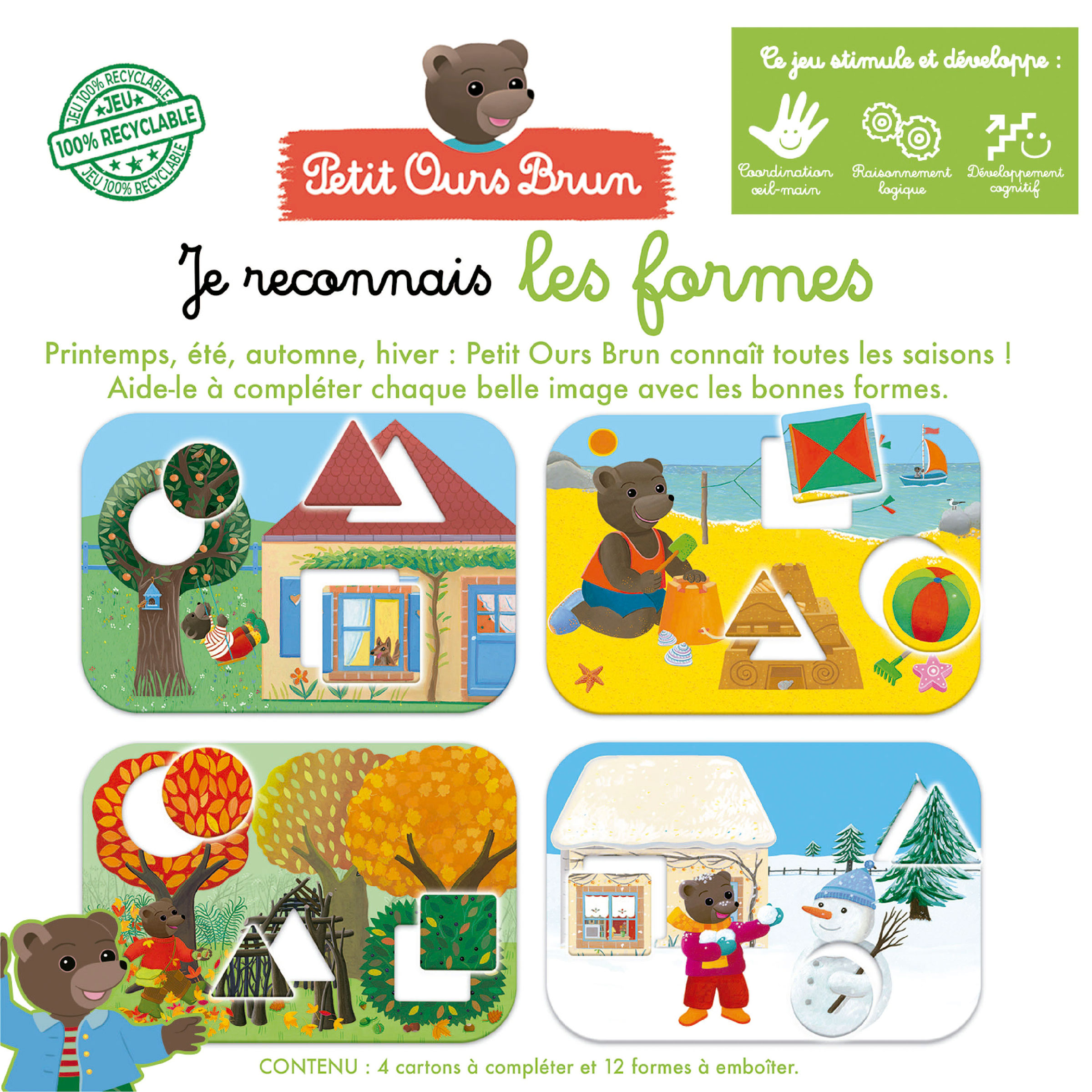 Le jeu pour apprendre les formes géométriques avec le PETIT OURS BRUN. Contient 4 plateaux et 12 pièces à encastrer.