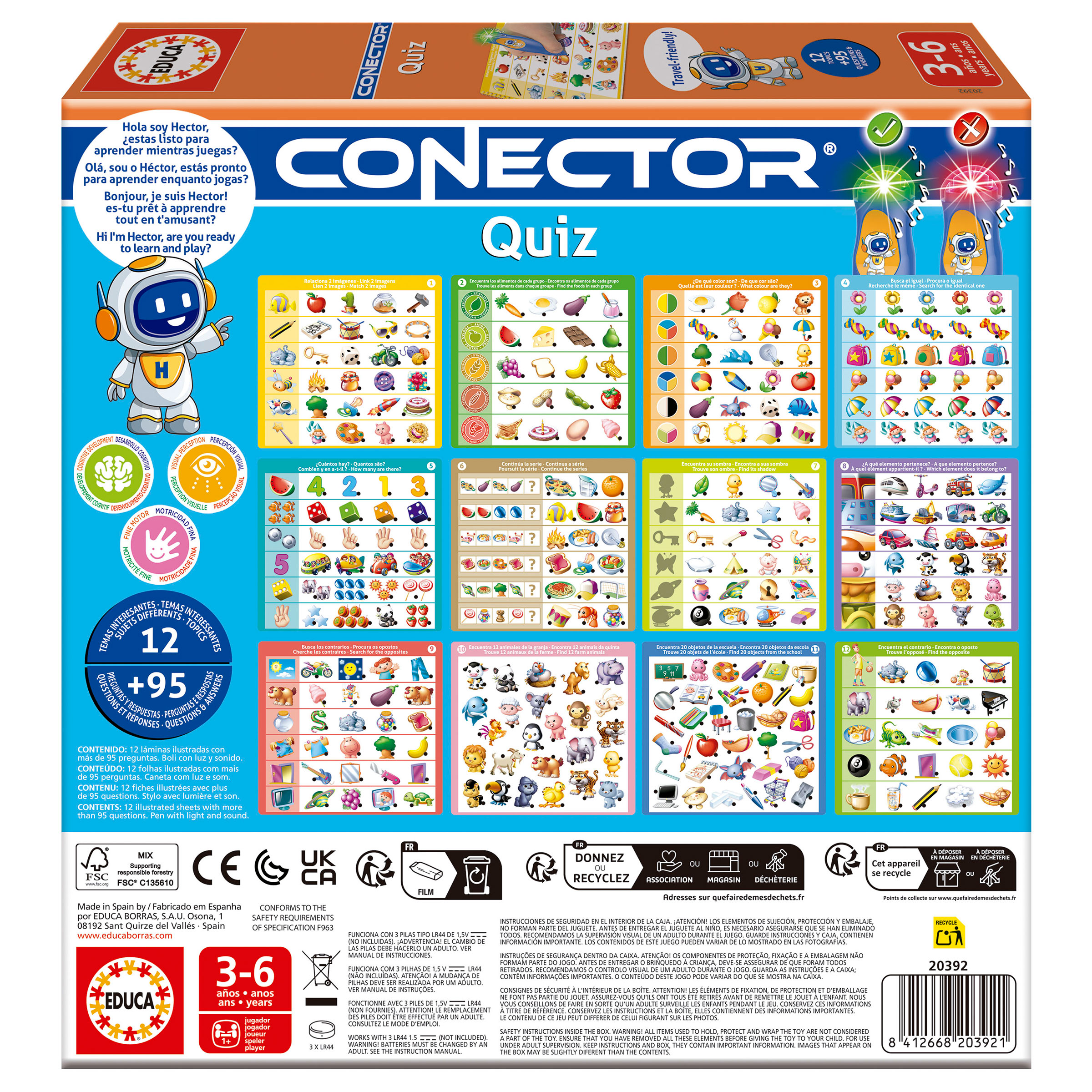 Emportez-le partout avec vous ! Nouveau Conector Quiz en format livre avec stylo avec son et lumière. Différents thèmes éducatifs avec lesquels les enfants exerceront leur capacité d’association, de raisonnement et d’observation. ILS APPRENDRONT : Les chiffres, les lettres, les formes et d’autres concepts éducatifs sont combinés dans ce jeu dans lequel les enfants exerceront leur capacité d’association, de raisonnement et d’observation. Contenu : 12 fiches avec 12 thèmes et plus de 95 questions.