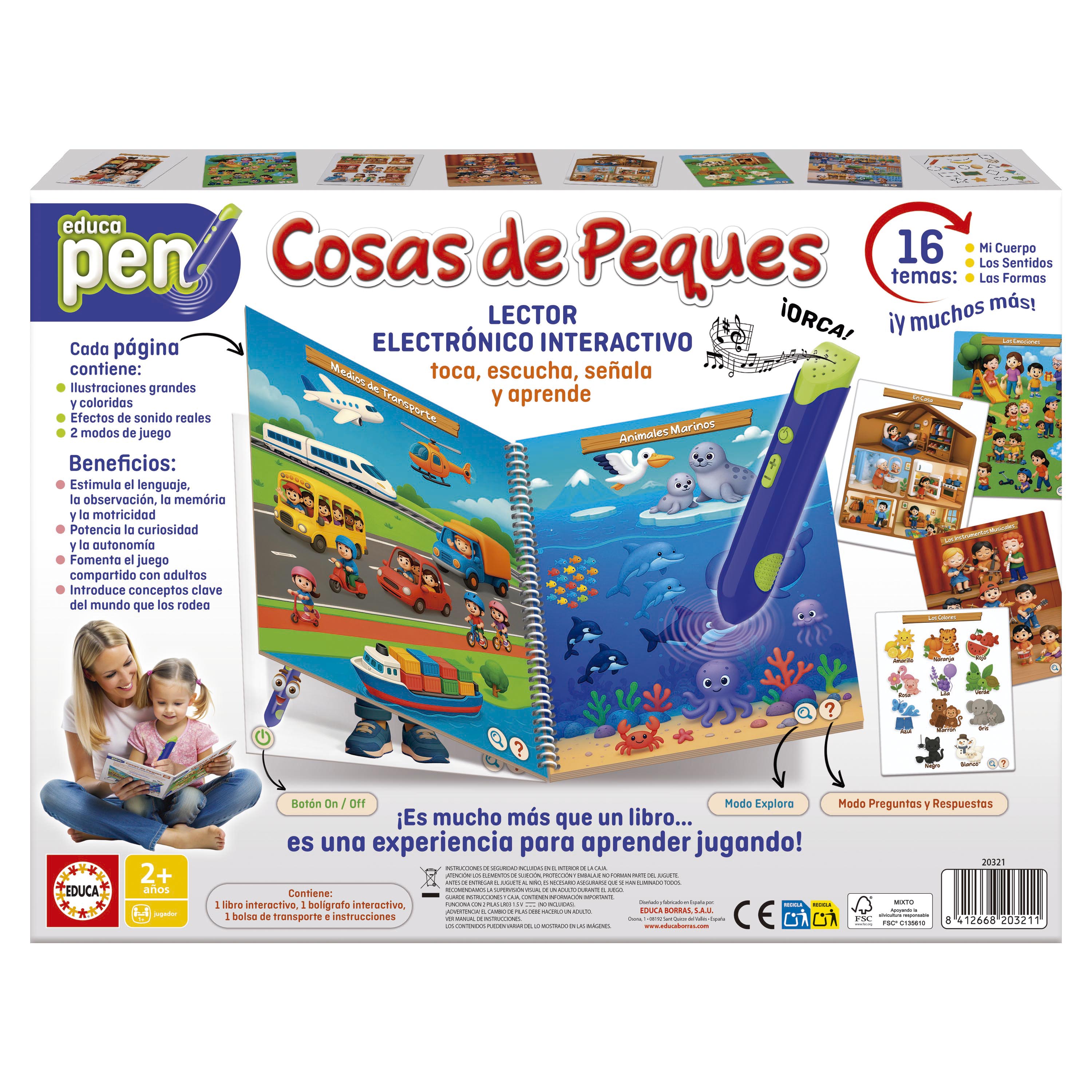 Educa Pen es un sistema educativo, interactivo y dinámico que combina dos modos de juego; aprendamos y encuentra la respuesta. Es un bolígrafo interactivo que al tocar imágenes o textos reproduce sonidos y explicación de distintas temáticas. Cada libro contiene 8 láminas (doble cara) con temáticas adaptadas a cada edad. Incluye conexión para auriculares y no incluye baterías.