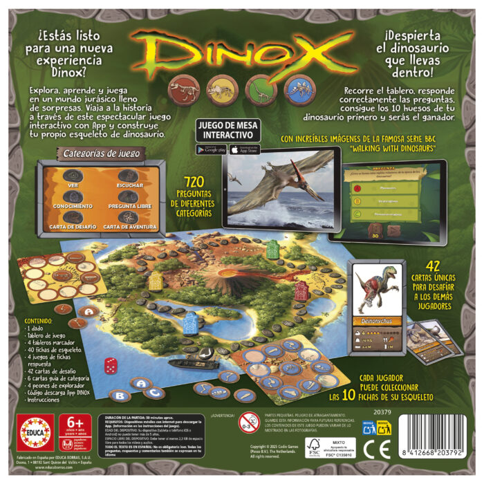 Dinox es un desafiante y emocionante juego de mesa audiovisual de competición para 2 a 4 jugadores mayores de 6 años, destinado a entretener, desafiar y construir conocimiento sobre el fascinante mundo de los Dinosaurios. Respondiendo correctamente a las preguntas, reúne las partes del esqueleto que necesitas para tu dinosaurio. El primer jugador que reúna todas las piezas para completar el dinosaurio gana. La APP la puedes descargar desde Android o Apple Store. Contenido: 1 dado, tablero de juego, 4 tableros marcador, 40 fichas de esqueleto, 4 juegos de fichas respuesta, 42 cartas de desafío, 6 cartas guía de categoría, 4 peones de explorador, código descarga App Dinox e instrucciones.